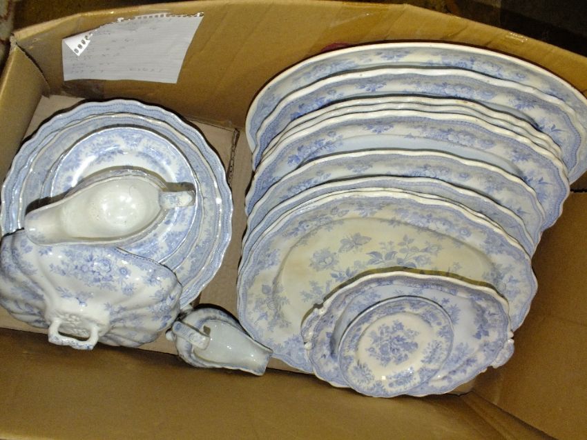 A LARGE BOX OF BLUE AND WHITE DINNERWARE TO INCLUDE ASIATIC PHEASANTS PATTERN CHINA