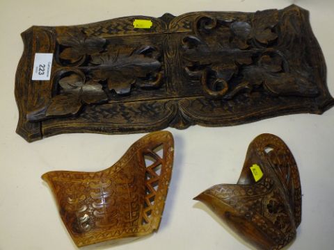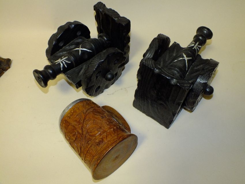A BLACK FOREST CARVED BOOK SLIDE, A PAIR OF WOODEN MODEL CANONS, TWO EASTERN EUROPEAN JUGS AND A TANKARD (6)