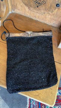 A GOOD ART DECO BLACK SEQUIN FACETED BEAD COCKTAIL BAG, with Dutch white metal frame, embossed frieze depicting landscape with windmill, no hallmarks, original interior in lilac and black stripe with original cotton floral detail lining