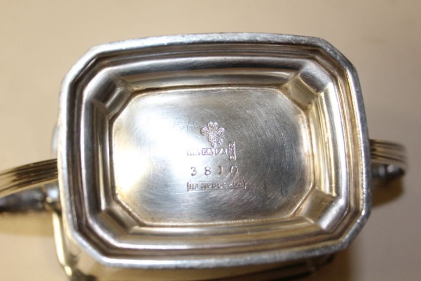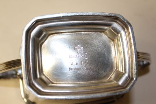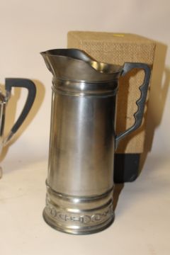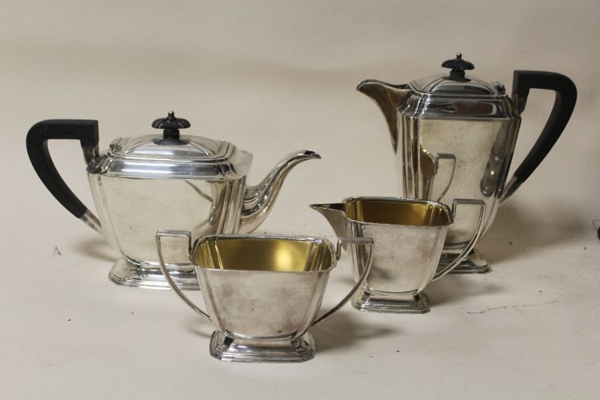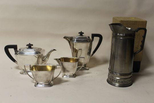 AN ART DECO STYLE SILVER PLATED FOUR PIECE TEA SERVICE TOGETHER WITH A BOXED CLAUDIO DESIGN METAL JUG