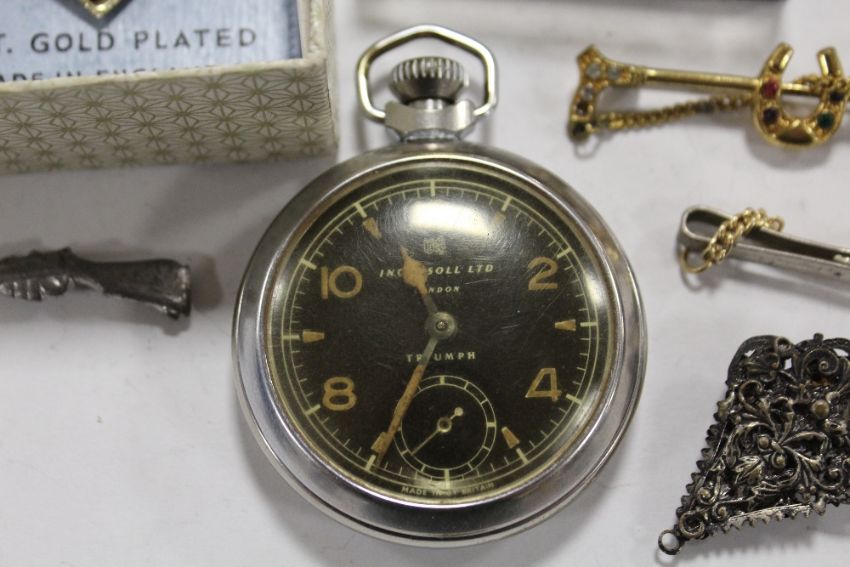A BOX OF COLLECTABLES TO INCLUDE A MILITARY STYLE INGERSOLL TRIUMPH POCKET WATCH