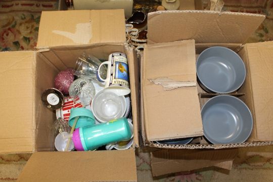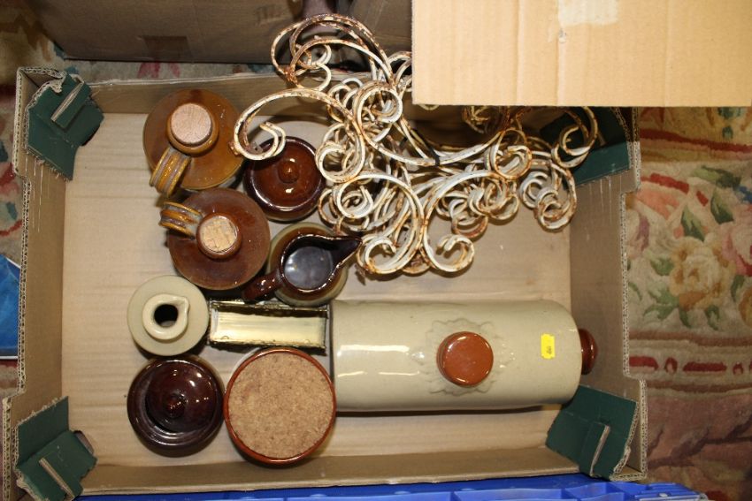 FOUR BOXES OF CERAMICS AND STONEWARE ETC. TO INCLUDE SMALL FLAGONS
