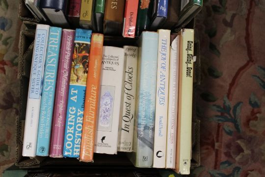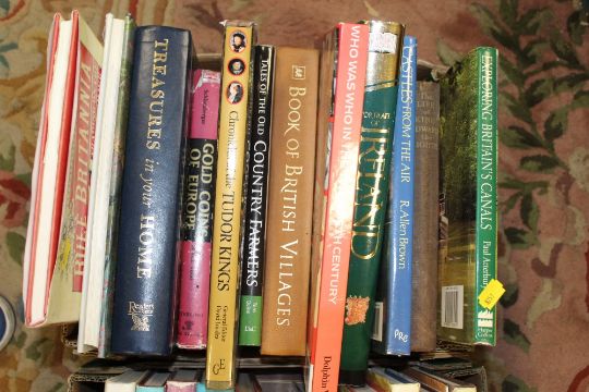 THREE SMALL TRAYS OF ASSORTED BOOKS TO INCLUDE HISTORY, REFERENCE GUIDES, FURNITURE BOOKS ETC.