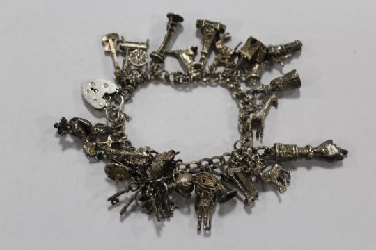 A SILVER CHARM BRACELET WITH A LARGE QUANTITY OF CHARMS APPROX WEIGHT 63.4G