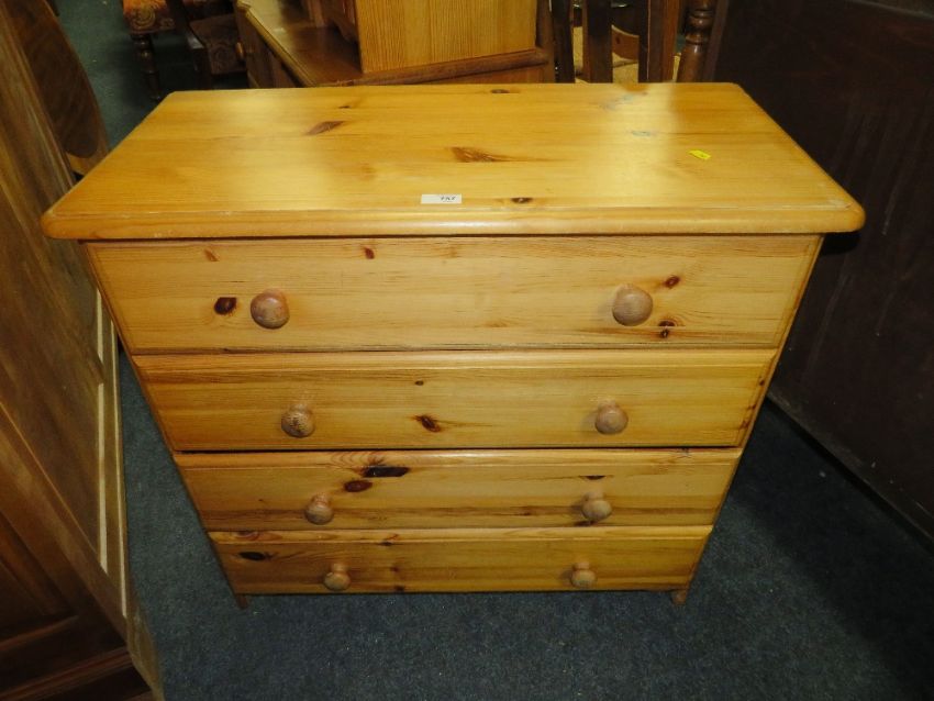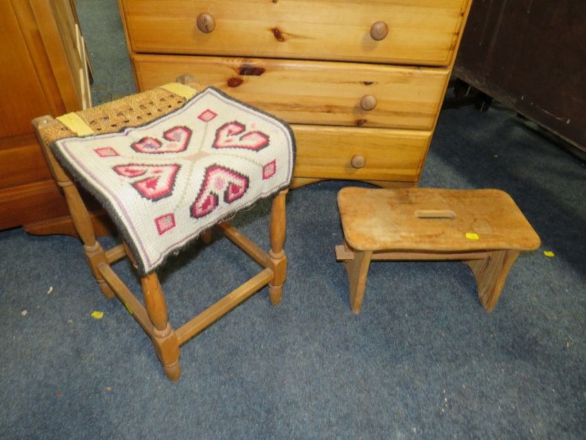 A PINE FOUR DRAWER CHEST, STOOL AND WICKER STOOL (3)