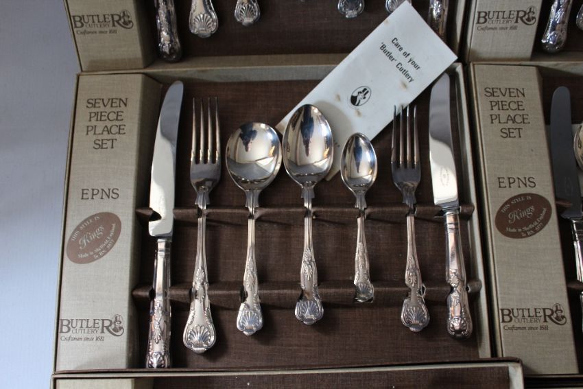 A GOOD QUANTITY OF SILVER PLATED KINGS PATTERN CUTLERY IN ORIGINAL BOXES BY BUTLER CUTLERY OF SHEFFIELD, many pieces appear to have not been used, consists of 1 x Pie Server, 1 x cheese knife, 1 x sauce ladle, 1 x soup ladle, 3 x potato spoon, 1 x set of six grapefruit spoons (box states six but has eight) 1 x set of 6 fish eaters (6 knives and 6 forks) and 8 x seven piece place settings