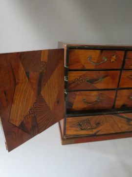 AN ORIENTAL INLAID TABLE CABINET, having two doors and single drawer, the doors opening to reveal six small drawers, inlaid parquetry, mother of pearl decoration and copper engraved mounts, H 41, W 44.5, D 23 cm, A/F