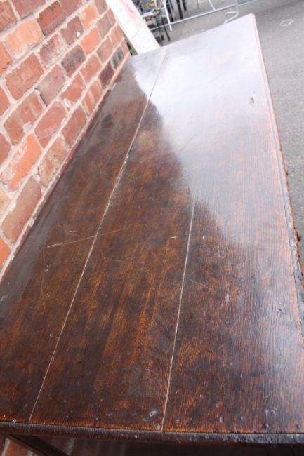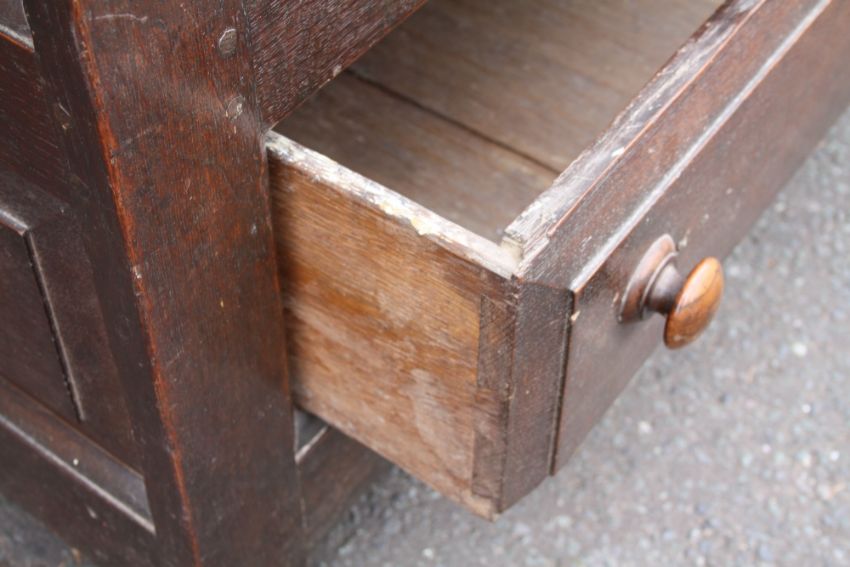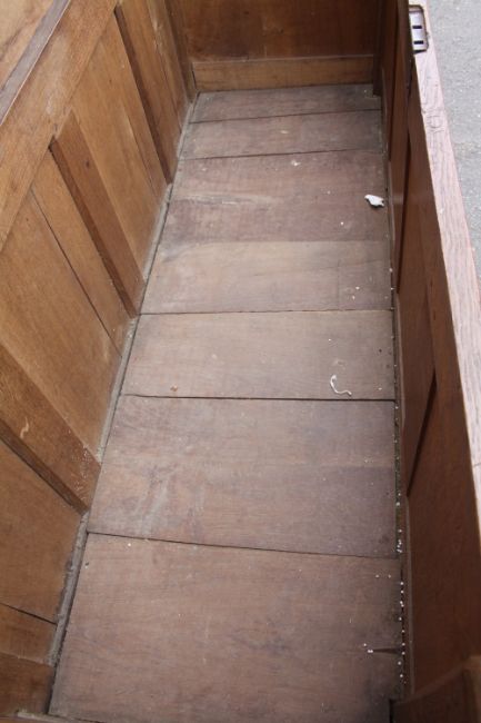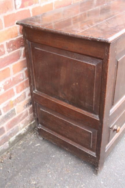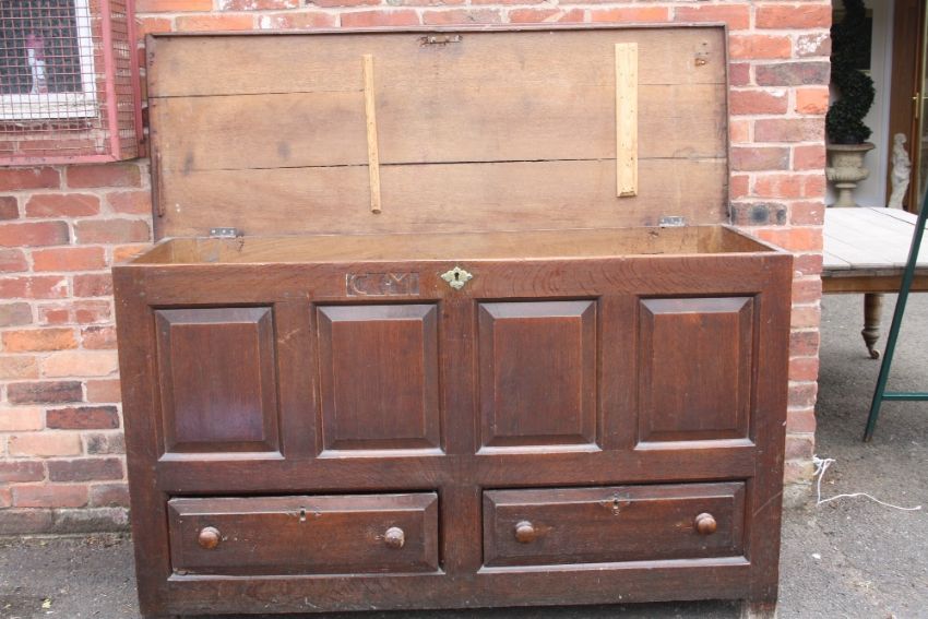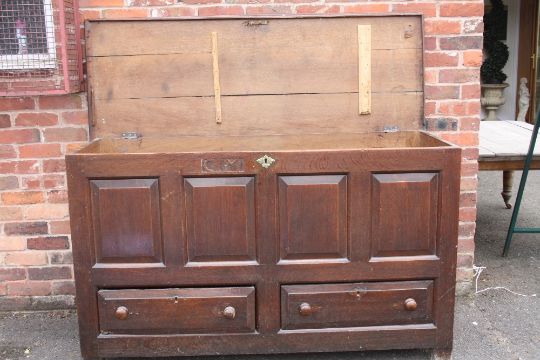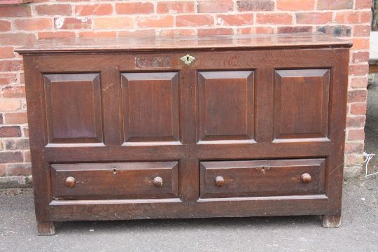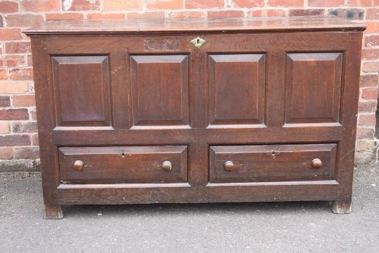 A GEORGIAN OAK OVERSIZED MULE CHEST, the hinged lid above a four panel front and twin drawers below, H 102 W 173 D 63 cm