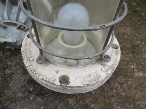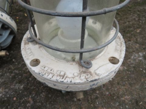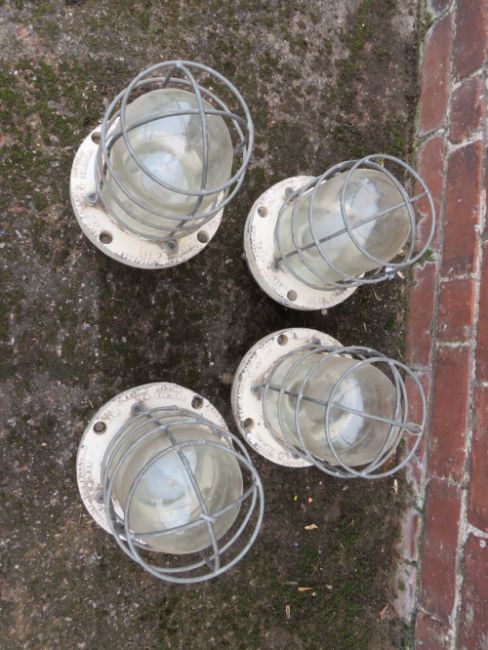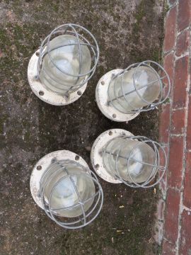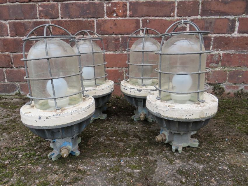 A SET OF FOUR VINTAGE INDUSTRIAL BULKHEAD PENDANT LIGHTS, H 37 cm, Dia. 19 cm
