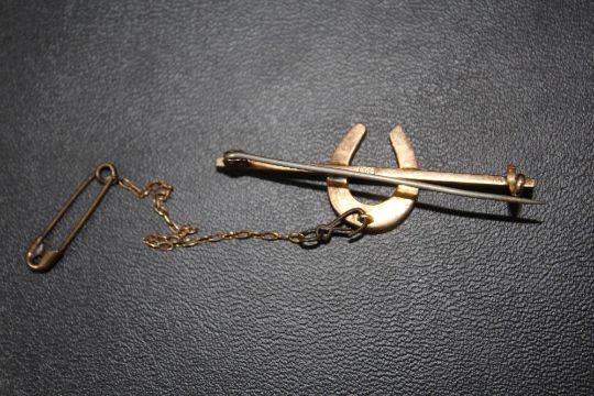 A 9 CARAT GOLD HORSESHOE BAR BROOCH, with steel pin and safety chain, approx weight 3.8g, W 5 cm