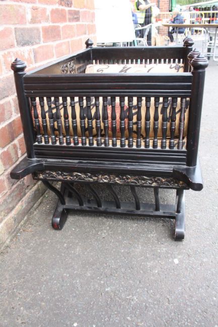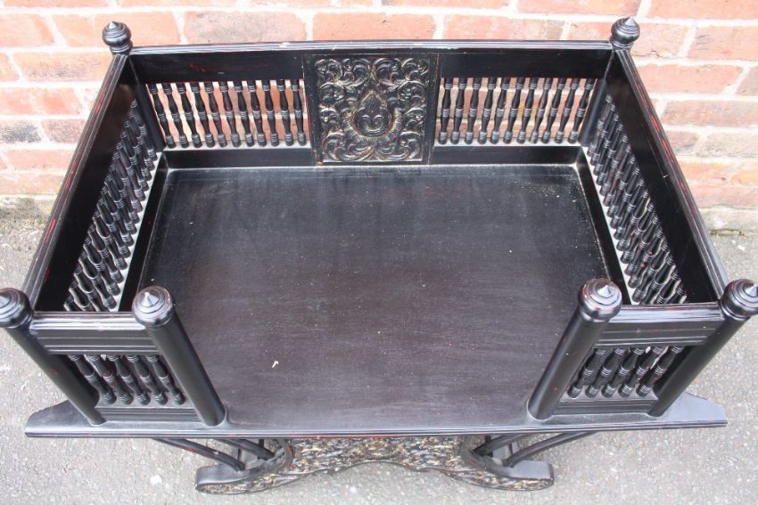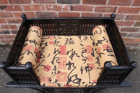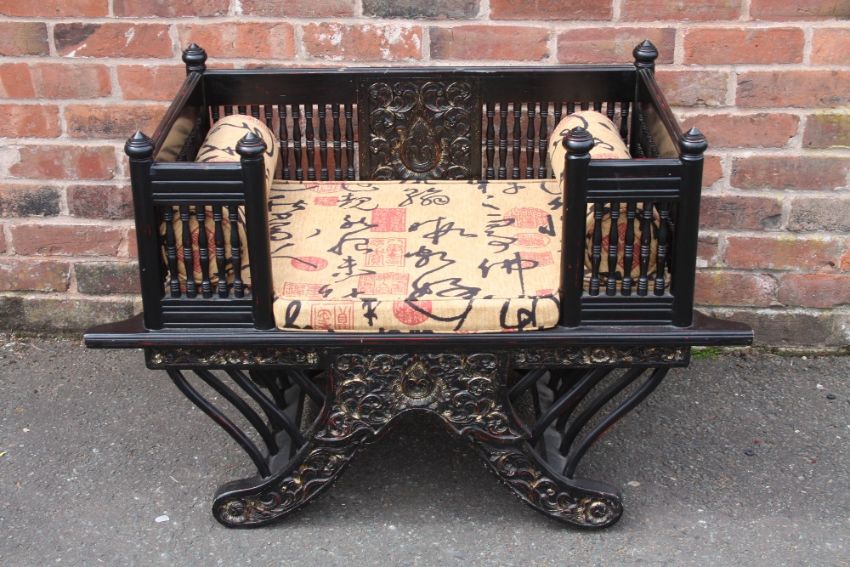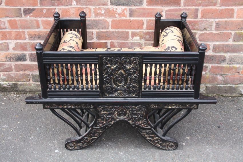 AN ANTIQUE EASTERN EBONISED ELEPHANT CHAIR, the rectangular seat with carved and spindle sides, raised on outsplayed supports with gilt decoration, further shaped supports, with loose cushions, H 72, W 107, D 59 cm