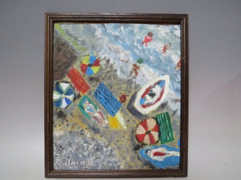 AFTER FRED YATES (1922-2008). Impressionist beach scene with boats and figures viewed from above, bears signature lower left, oil on board, framed, 27 x 23 cm