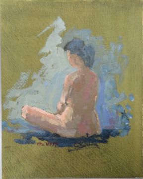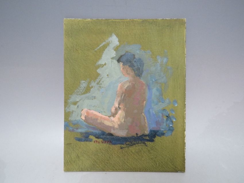 ERIC WARD (b.1945). Impressionist rear view study of a female seated nude, signed lower left, oil on board, unframed, 25 x 20 cm