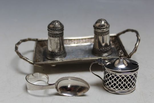 A SMALL COLLECTION OF SILVER CONSISTING OF A PAIR OF MIDDLE EASTERN CONDIMENTS ON A SMALL TRAY STAMPED 925, a small hallmarked silver mustard pot and a spoon (3)