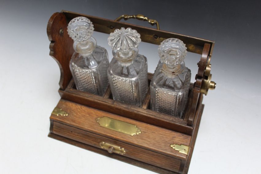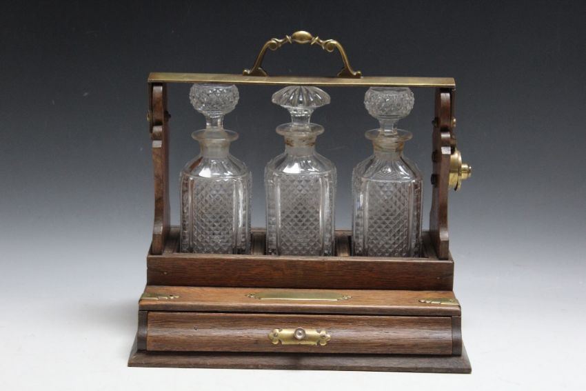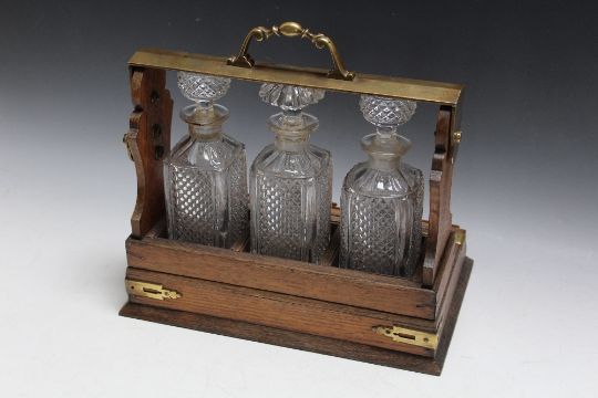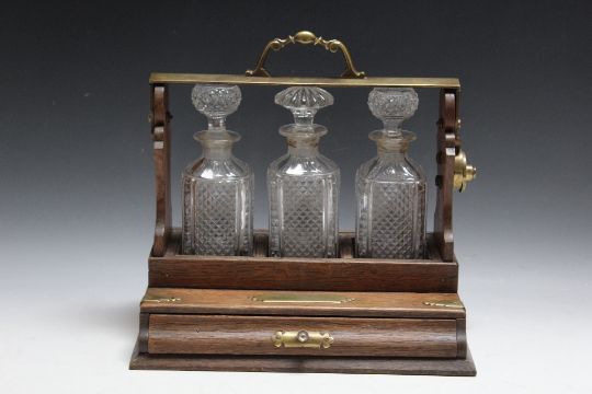 AN OAK THREE BOTTLE TANTALUS WITH DRAW, W 34.75 cm