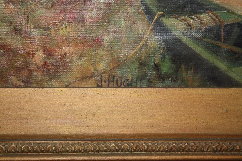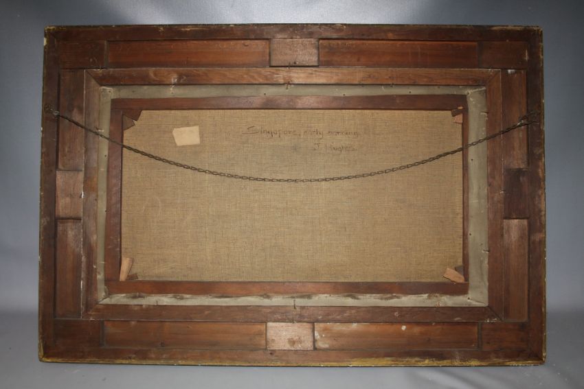 J. HUGHES (XIX-XX). Singapore coastal scene with village, boats and figures 'Singapore early Morning', see verso, signed lower right, oil on canvas, framed, 44 x 80 cm