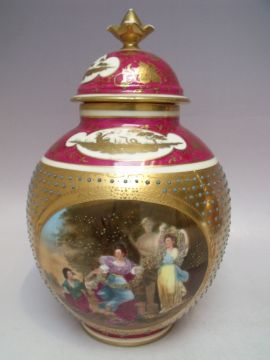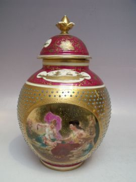Condition Report:Wear to gilding on finials of both lids, one vase cracked in two places on rim.