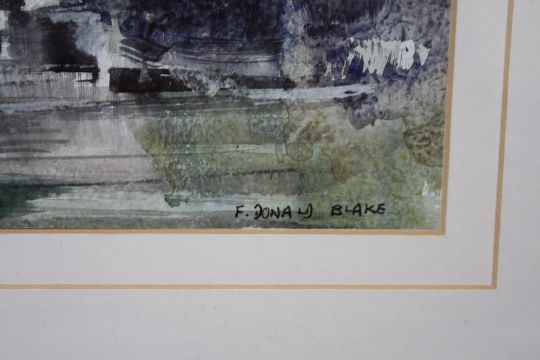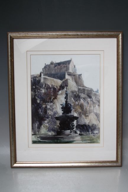 FREDERICK DONALD BLAKE (1908-1997). Study of a fountain before Edinburgh castle, signed lower right, mixed media on paper, framed and glazed, 32 x 25 cm