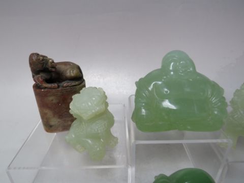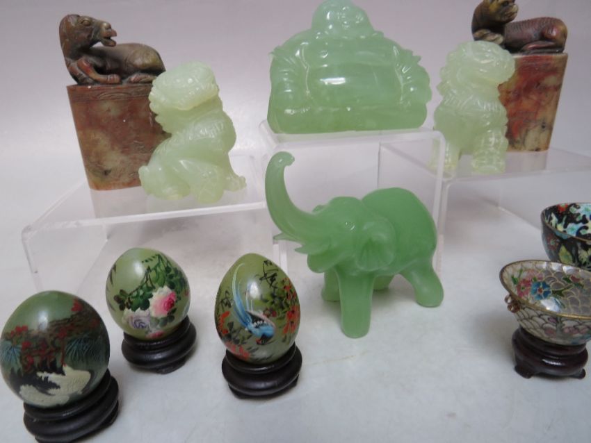 A COLLECTION OF 20TH CENTURY ORIENTAL FIGURES ETC., to include a pair of carved modern jade dogs of fo, two carved seals with mythical figural surmounts, and three miniature hand painted eggs (11)