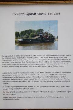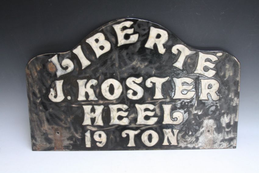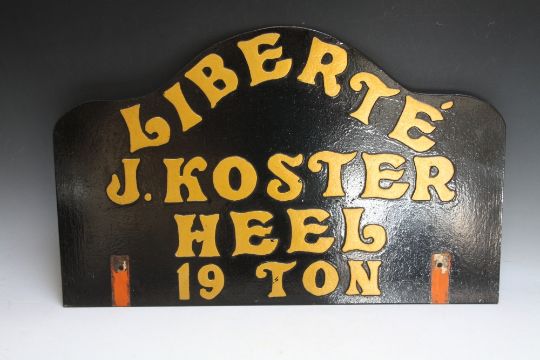 A VINTAGE CAST PAINTED METAL NAME PLATE / PLATE RELATING TO THE DUTCH TUG BOAT 'LIBERTE', H 40.5 cm, W 65 cm, together with a framed information sheet relating to The Liberte