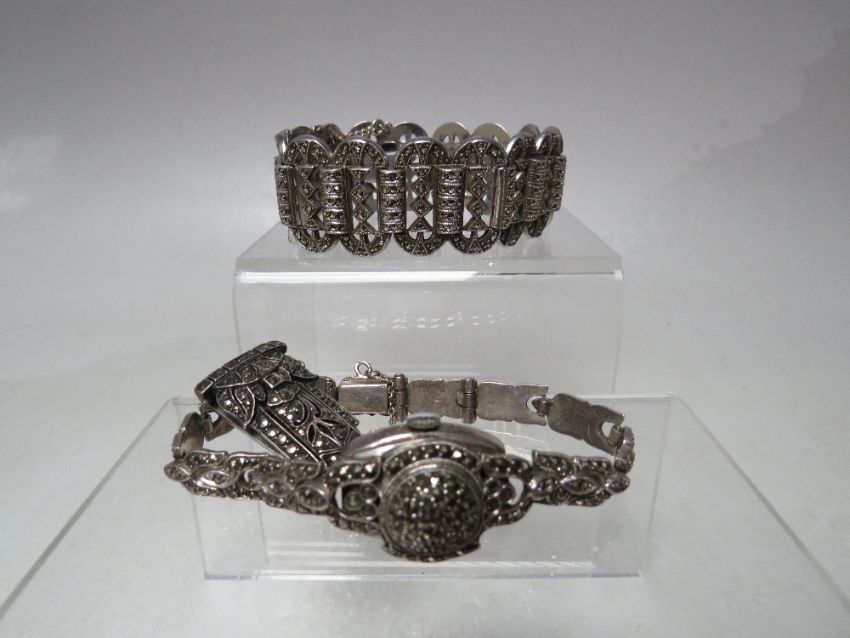 AN ART DECO STYLE SILVER AND MARCASITE PANEL LINK BRACELET, each hinged link marked silver to reverse, together with a sterling silver and marcasite 'EFFEE' wristwatch and a dress clip (3)