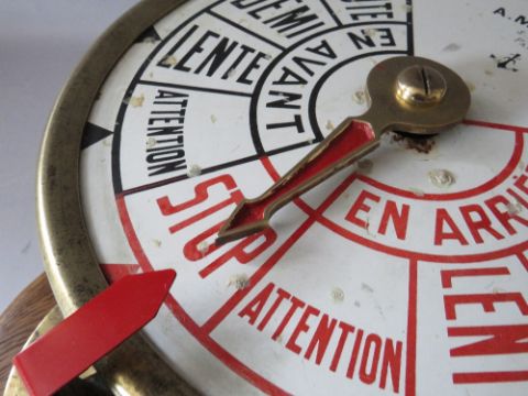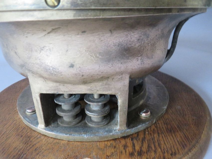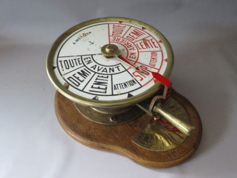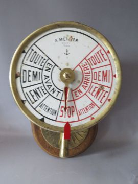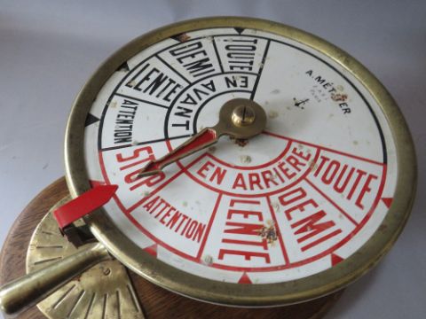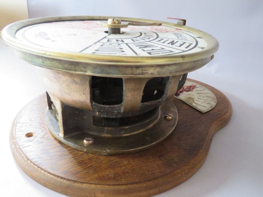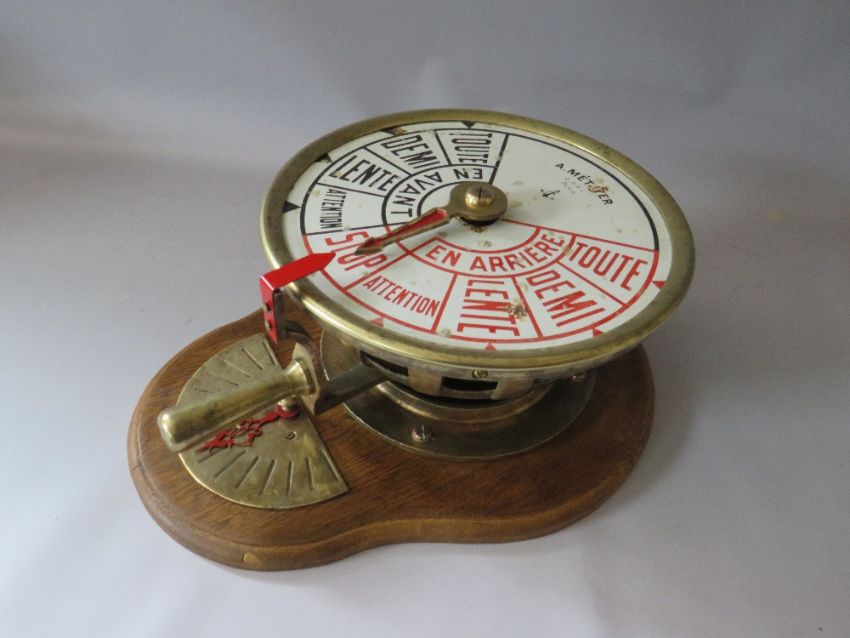 A BRASS CASED SHIPS TELEGRAPH WITH INCLINOMETER BY A METAYER OF PARIS, mounted on an oak wall board, H 45 cm
