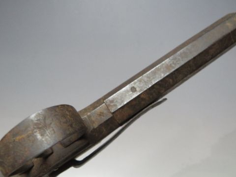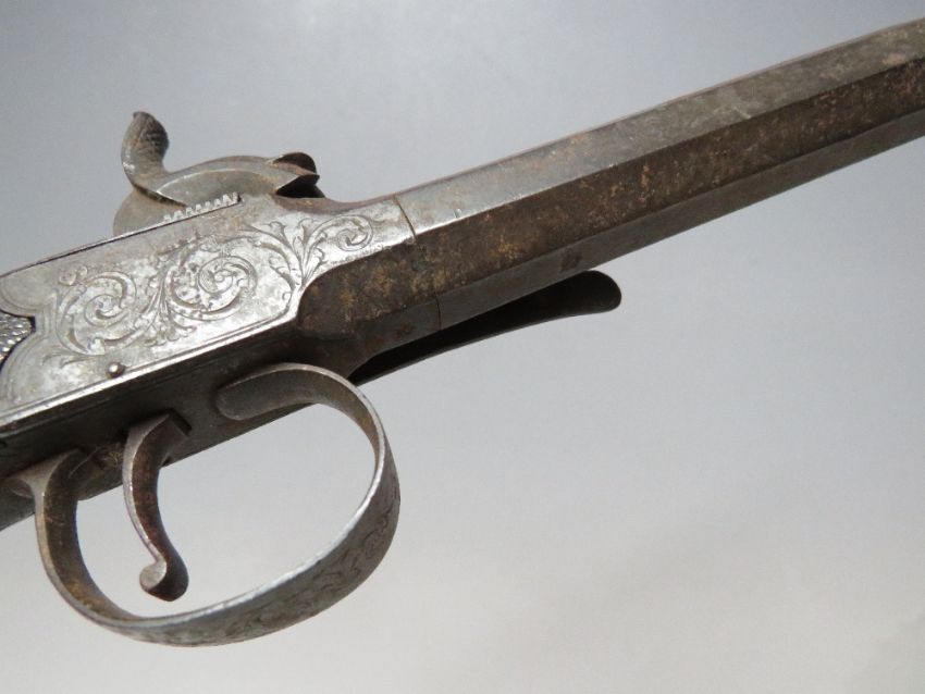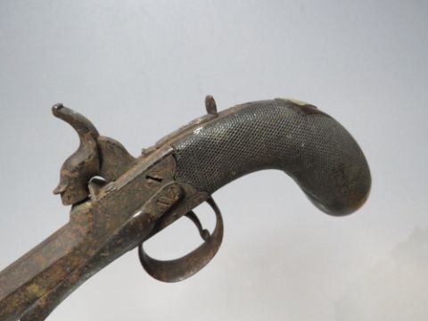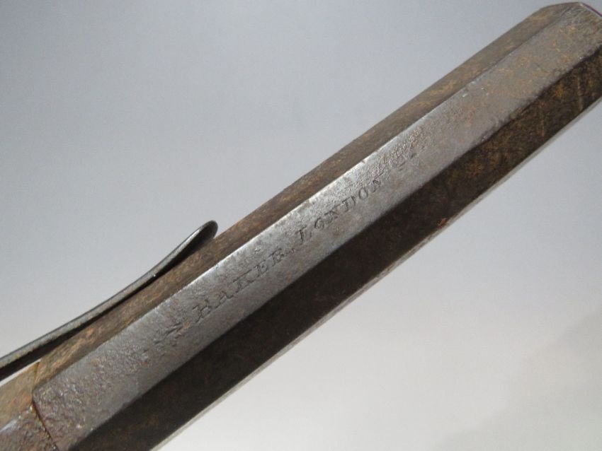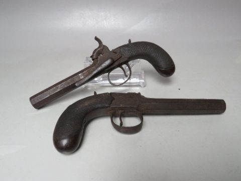 A PAIR OF ANTIQUE PERCUSSION CAP PISTOLS MARKED BAKER - LONDON, detachable octagonal barrel, each with belt hook, barrel L 8.5 cm, overall L 19 cm, one A/F