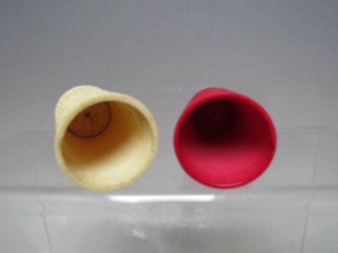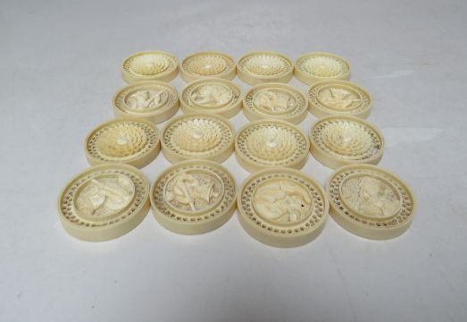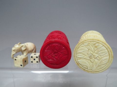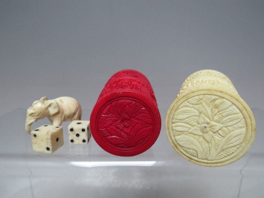 A PAIR OF LATE 19TH / EARLY 20TH CENTURY CHINESE CANTON CARVED IVORY DIE-SHAKERS, each carved in relief with figures amongst trees,one stained red, tallest H 6.4 cm, together with thirty two ivory gaming counters, sixteen stained red, each carved in relief to both sides, plus a small carved elephant figure and two die (37)