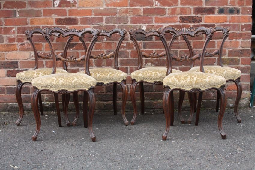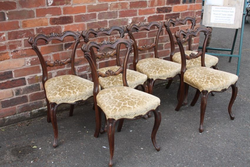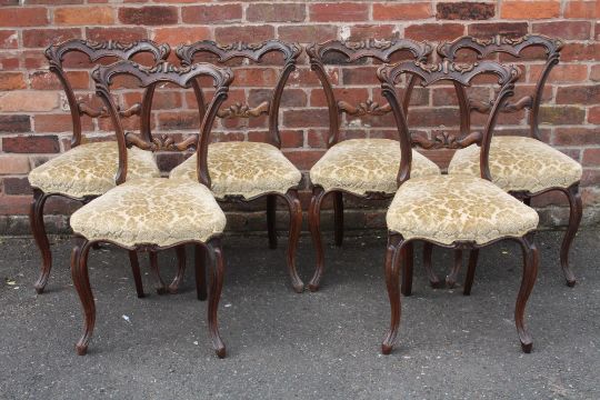 A SET OF SIX VICTORIAN MAHOGANY CROWN BACKED DINING CHAIRS, with carved top and mid rails, raised on shaped cabriole supports (6)