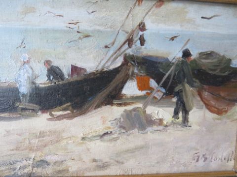 (XX). Coastal beach scene with figures and fishing boats, indistinctly signed lower right, oil; on canvas board, framed, 14 x 29 cm