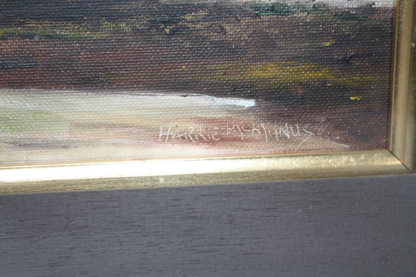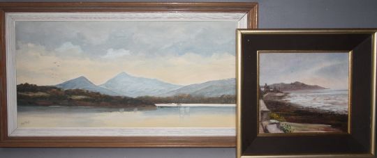 HARRY McMANUS (XX) IRISH SCHOOL. 'Evening Sky, Howth Head, Dublin', see verso, signed lower right, oil on board, framed and glazed, 20 x 23 cm, together with BATTLE (XX) Irish School 'Sugarloaf Mountain, Glengarrif, Cork' see verso, signed lower left, oil on board, framed, 28 x 59 cm (2)