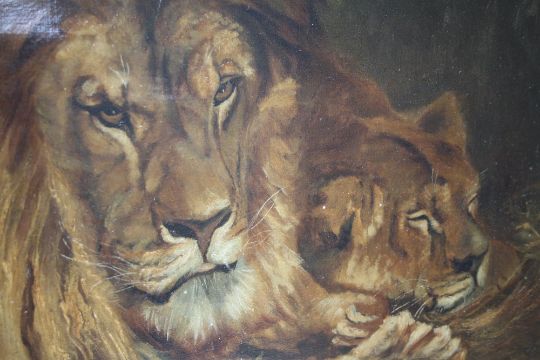 ENGLISH SCHOOL (XX). Study of a Lion and Lioness, oil on re-lined canvas, gilt framed, 50 x 75 cm