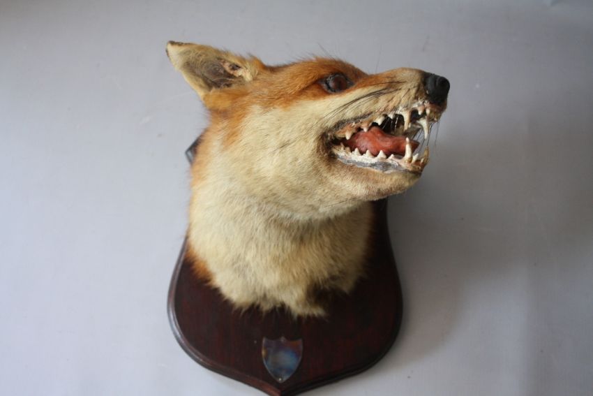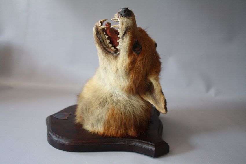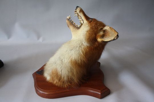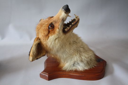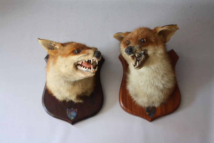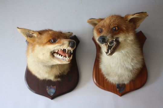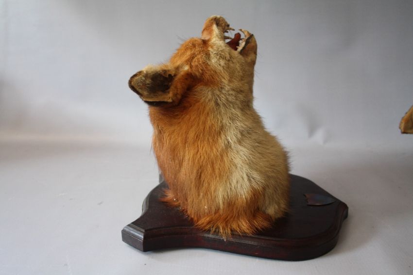 TAXIDERMY - A MATCHED PAIR OF FOX MASKS MOUNTED ON OAK WALL SHIELDS , tallest approx. overall H 27 cm (2)
