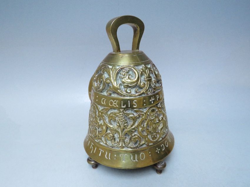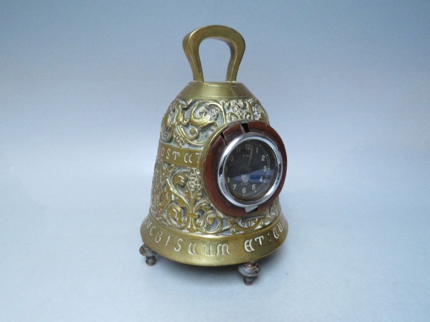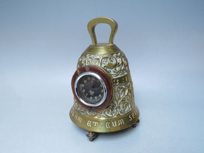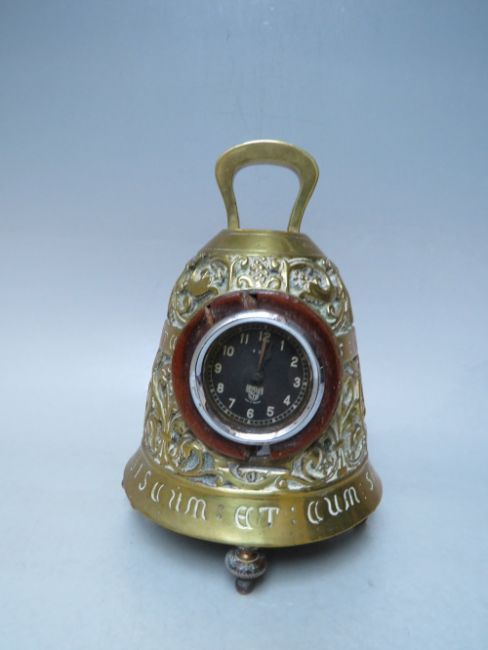 AN UNUSUAL FRENCH BRASS CLOCK CASE WITH LATER FITTED SMITHS CAR CLOCK, the clock case in the form of a large bell raised on four feet, embossed with bands of scrolled, fruiting and flowering vines, quatrefoil figural panels and Latin inscriptions 'PATER NOSTER IN COELIS','DOMINUS VOBISCUM', 'ET CUM SPIRITU TUO' , with single handle surmount, H 20 cm