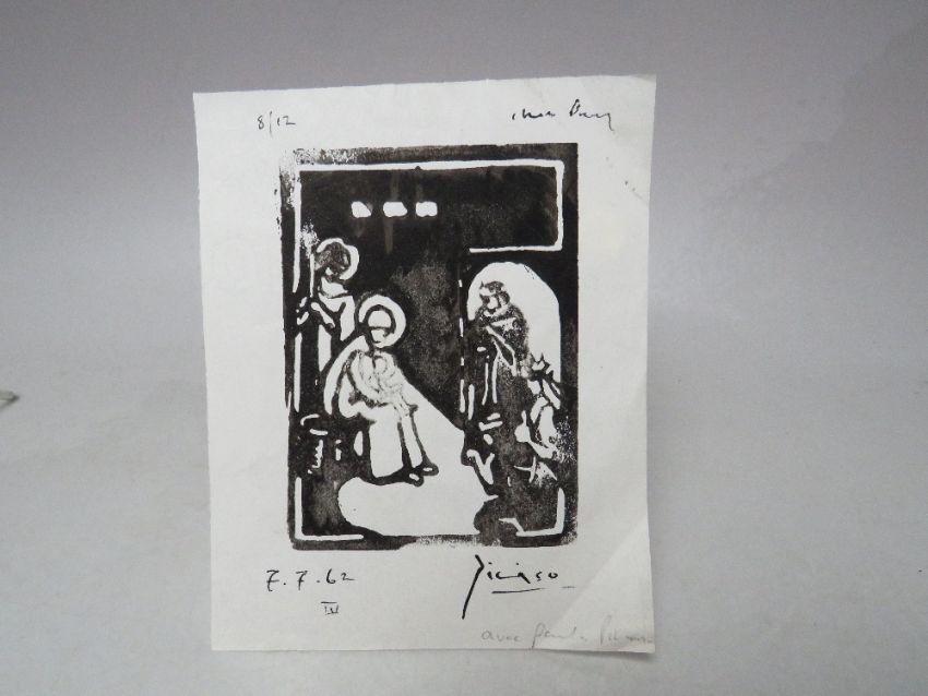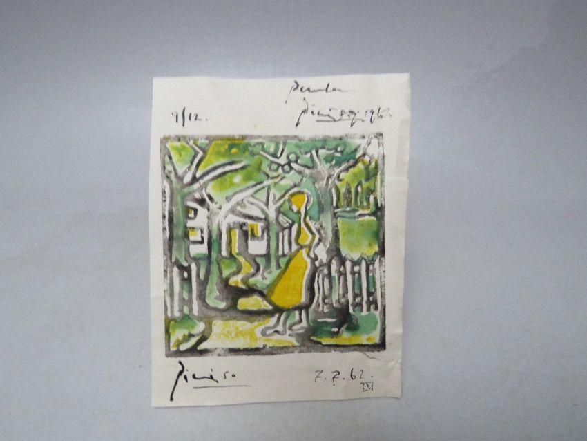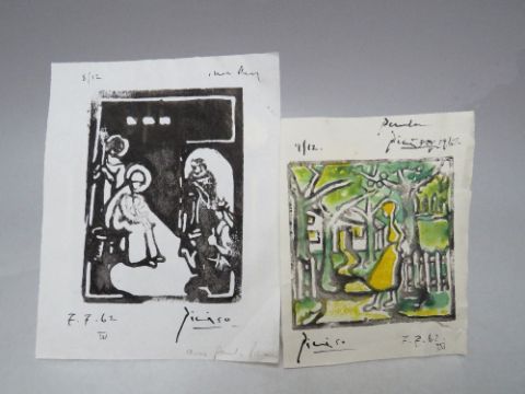 AFTER PABLO RUIZ PICASSO (1881-1973). Two modernist figure studies, interior scene and woodland cottage, both bearing signatures and dated 1962, mixed media on paper, unframed, smallest 11 x 9 cm, largest 14 x 11 cm