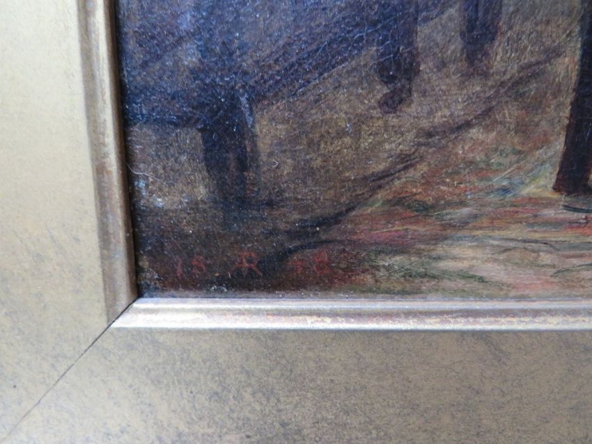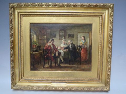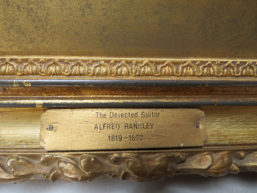 ALFRED RANKLEY (1819-1872). Interior scene with figures 'The Dejected Suitor', signed with initials lower left, oil on canvas, framed, 23 x 30 cm