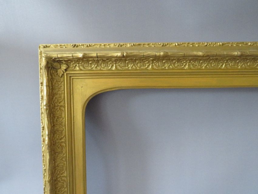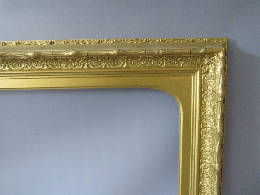 A 19TH CENTURY DECORATIVE GOLD FRAME, with arched top integral slip, some restoration, frame W 8 cm, rebate 41 x 61 cm
