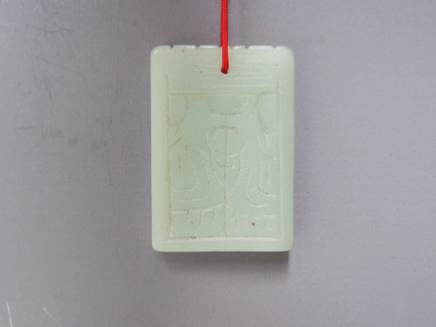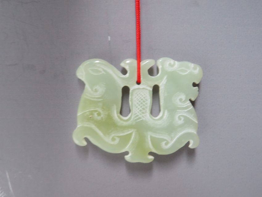 A CHINESE JADE CARVED AND PIERCED FIGURAL PENDANT, W 5.8 cm together with a rectangular pendant with mythical animal embellishment to both sides 4.8 x 3.3 x 0.5 cm (2)
