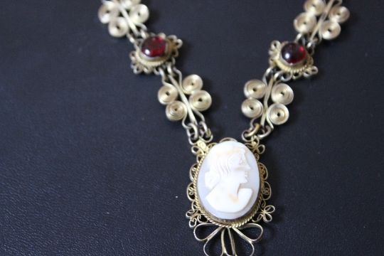 AN ANTIQUE CAMEO WIREWORK PENDANT, with red cabochon detailing,cameo measures H 2 cm