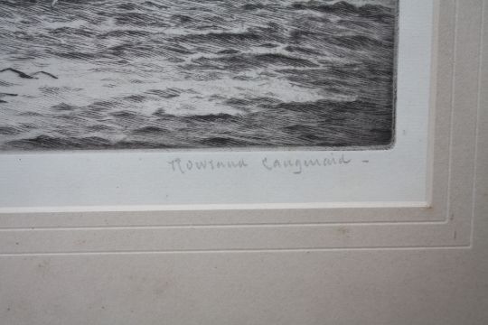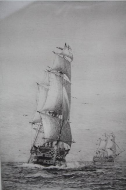 ROWLAND JOHN ROBB LANGMAID (1897-1956). 'H.M.S. Victory & Temeraire' see label verso, signed in pencil lower right, etching on paper, framed and glazed, 32 x 22 cm