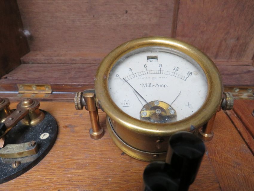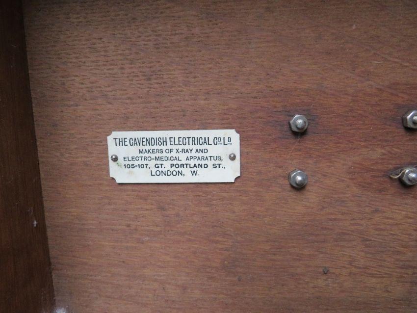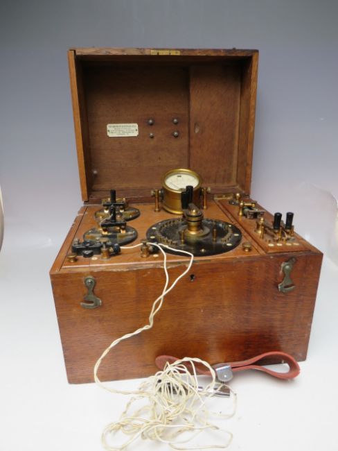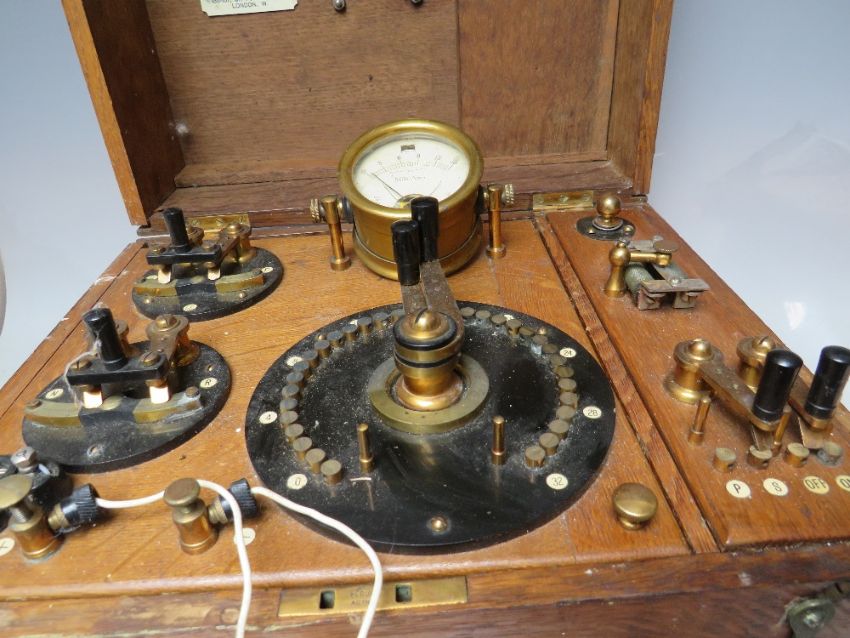 AN EARLY 20TH CENTURY OAK CASED ELECTRO - MEDICAL THERAPY MACHINE BY THE CAVENDISH ELECTRICAL Co. Ltd. LONDON, makers of x-ray and electro-medical apparatus, untested and sold as a collector's piece, case dimensions 33 x 26.5 x 26 cm