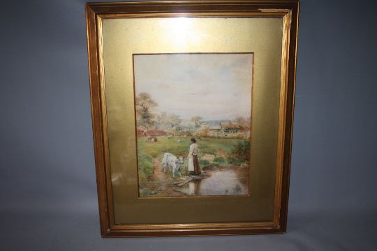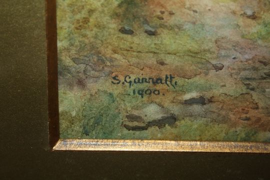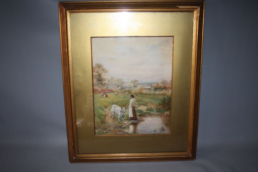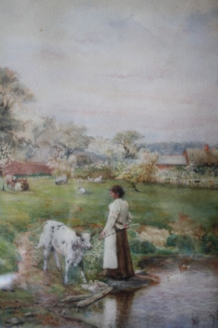 S. GARRATT (XIX-XX). Rural farmstead scene with cattle, sheep and woman with calf by a pond, signed and dated 1900 lower left, watercolour, framed and glazed, 35 x 28 cm