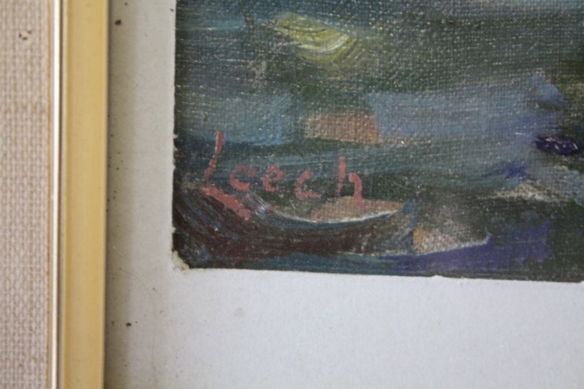 LEECH (XIX-XX). Impressionist study of figures fishing from a jetty, signed lower left, oil on canvas laid on board, framed and glazed, 26 x 22 cm