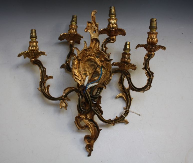 A LATE 19TH / EARLY 20TH GILT METAL FIVE BRANCH WALL APPLIQUE IN THE ROCOCO STYLE, wired for electricity, H 43 cm