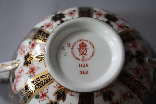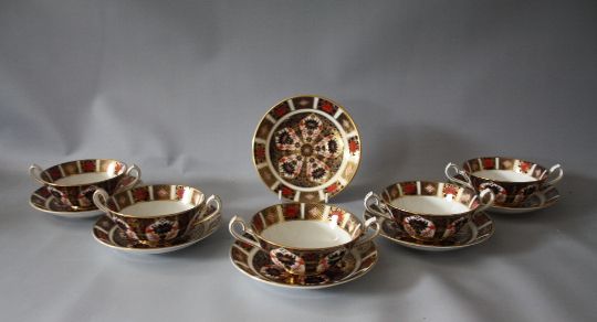 A SET OF FIVE ROYAL CROWN DERBY IMARI PATTERN 1128 CREAM SOUP AND SAUCER SETS, all marked as seconds together with a spare saucer, saucer Dia. 16.5 cm