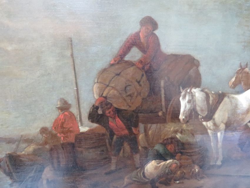 ATTRIBUTED TO PHILLIPPE WOUWERMANS (1619-1668). Coastal scene with horses, carts and figures loading sailing vessels with their goods, unsigned, oil on panel, framed, 25 x 36 cm