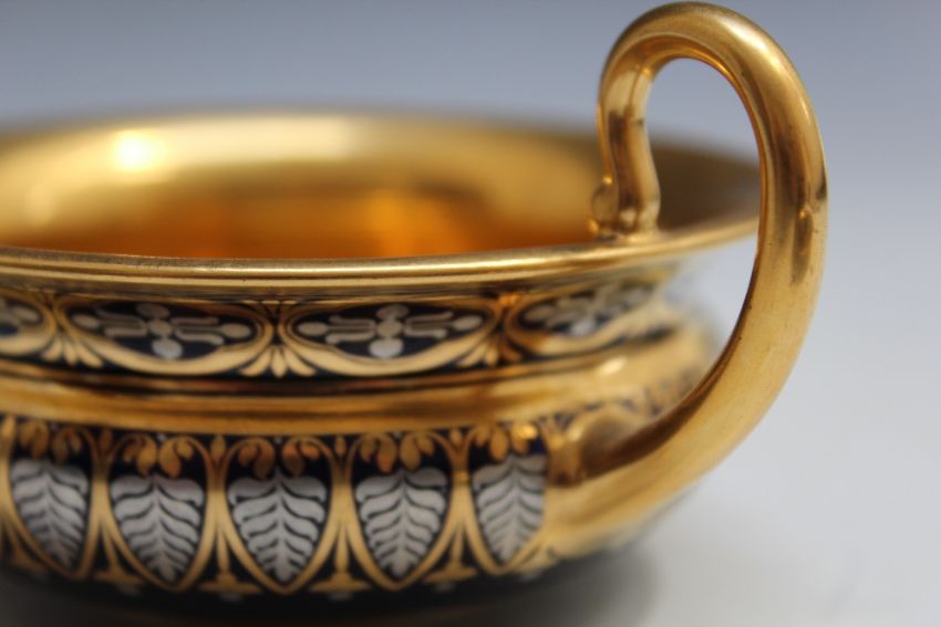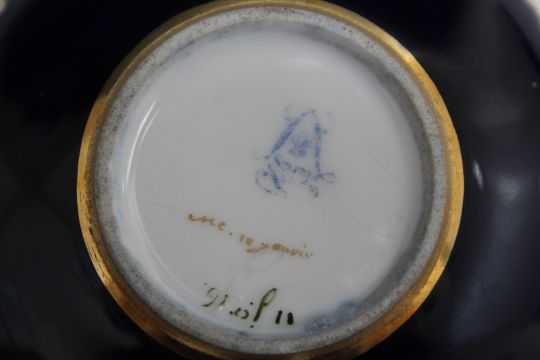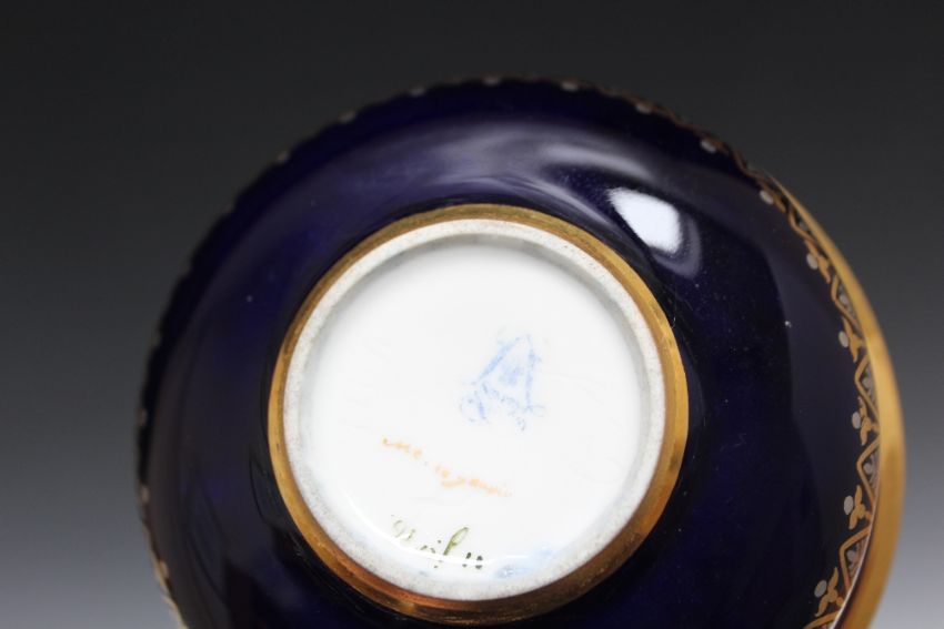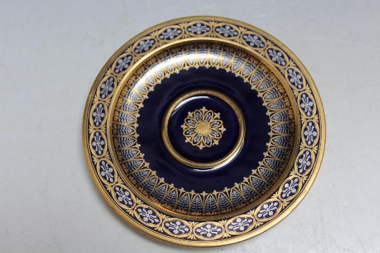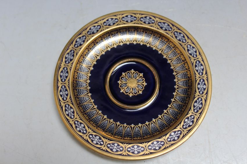 A SEVRES TYPE HIGHLY GILDED CABINET CUP AND SAUCER, on cobalt blue background, marks to both cup and saucer indistinct - see images, Dia 14.5 cm
