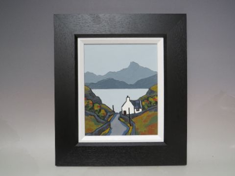 DAVID BARNES (XX-XXI). Welsh school, mountainous scene with roadside cottage 'Towards the Lake', signed and inscribed verso, acrylic on board, framed, 24 x 19 cm