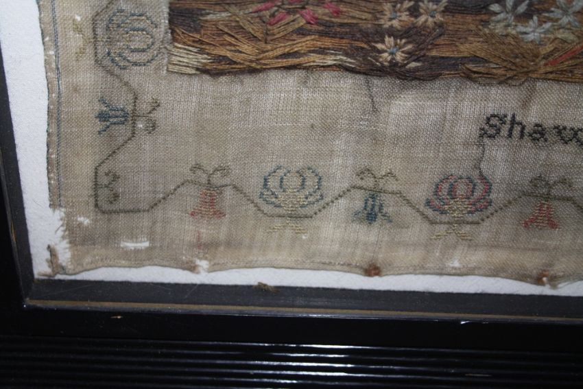 A LARGE GEORGE III PICTORIAL SAMPLER OF SHAWCROSS HALL NEAR WHALEY BRIDGE, worked by Mary Ann Slack 17th Dec 1819, aged 9 years, in coloured woollen and silk threads with religious verse and various animal and floral motifs set within a foliate border, in a glazed ebonised frame, 53 x 53 cm (sampler) S/D