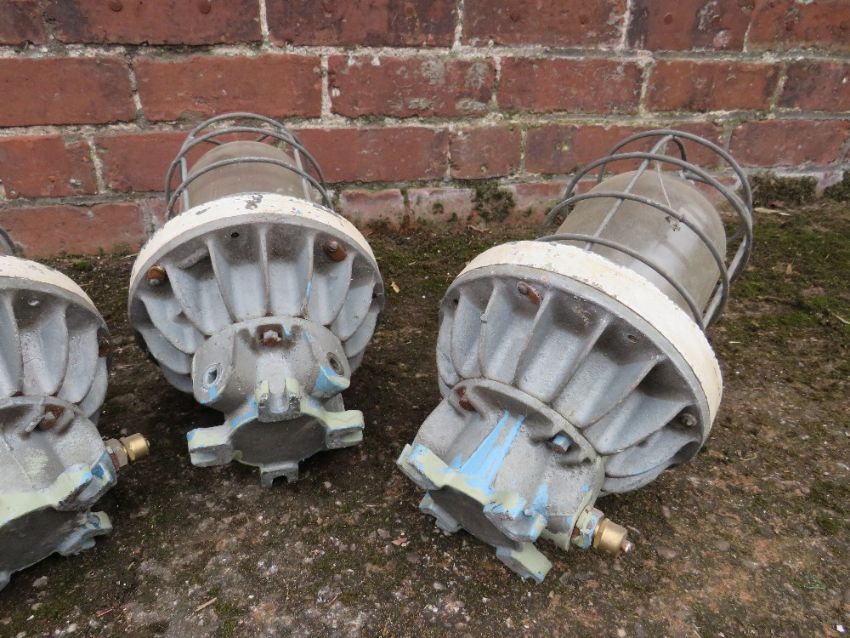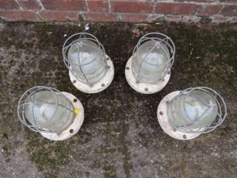 A SET OF FOUR VINTAGE INDUSTRIAL BULKHEAD PENDANT LIGHTS, H 37 cm, Dia. 19 cm